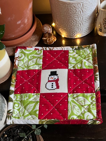 For this cross-stitch and the next one, I finished them into these charming coffee/pot/plant mats. Really whatever you would like to use them for. I used a straightforward quilting pattern of nine squares; each square measuring 3 ½ inches. I might make more since it is a great way to practice my quilting and binding techniques.