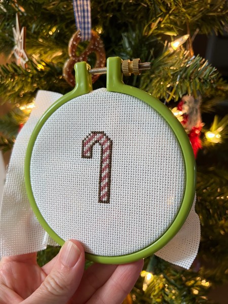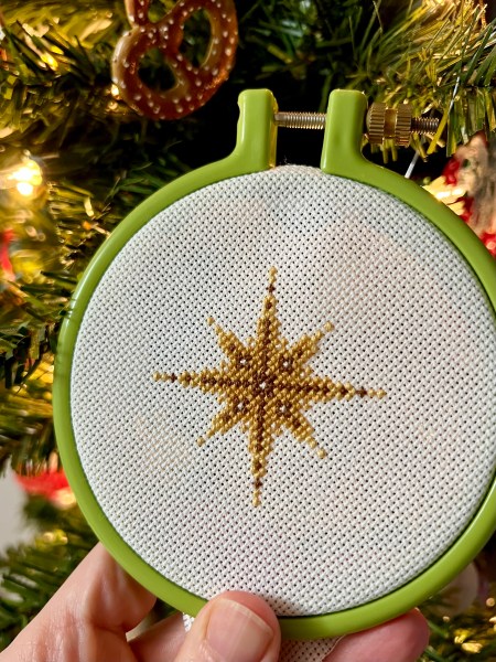 I only stitched the 14-count version of this cross stitch. Unfortunately, I forgot to take a photograph of it finished as an ornament. Thankfully, I did take some pictures before making any cuts, just in case things didn’t go as planned.